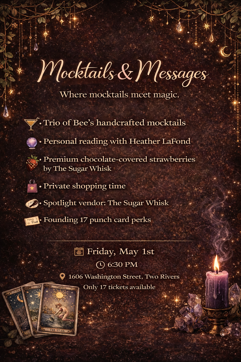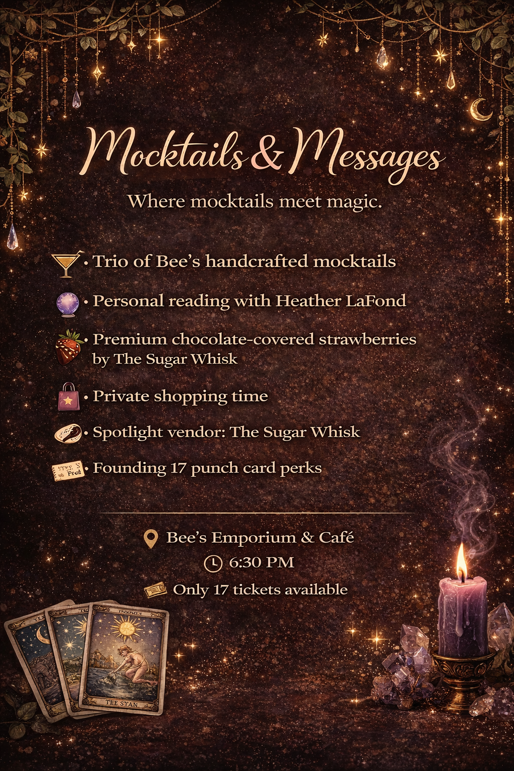Join us for an elegant evening of handcrafted mocktails, meaningful messages, and a relaxed, welcoming atmosphere at Bee’s Emporium & Café. We’re excited to bring something fresh, fun, and truly unique to the community with an experience unlike anything else in the area.