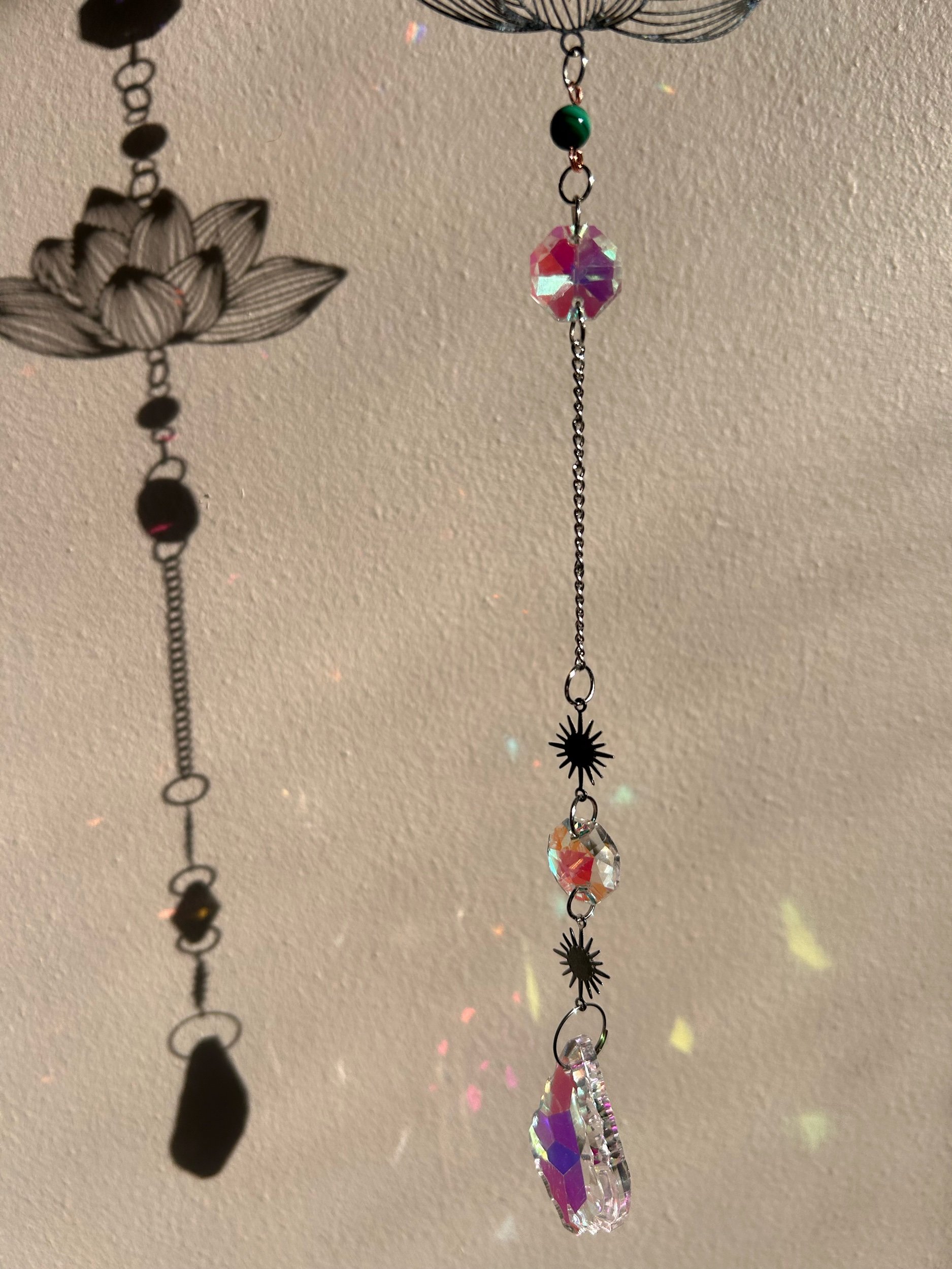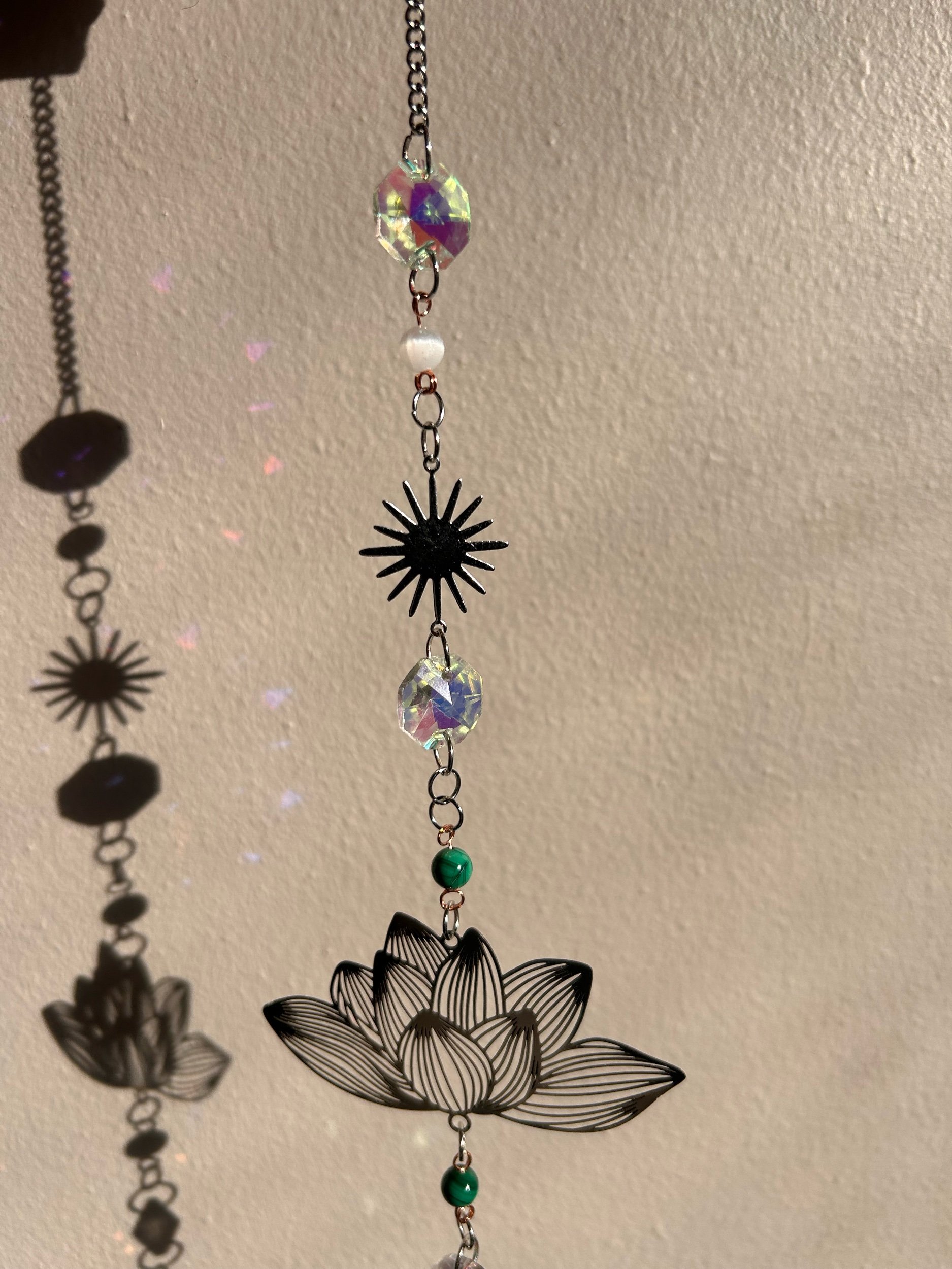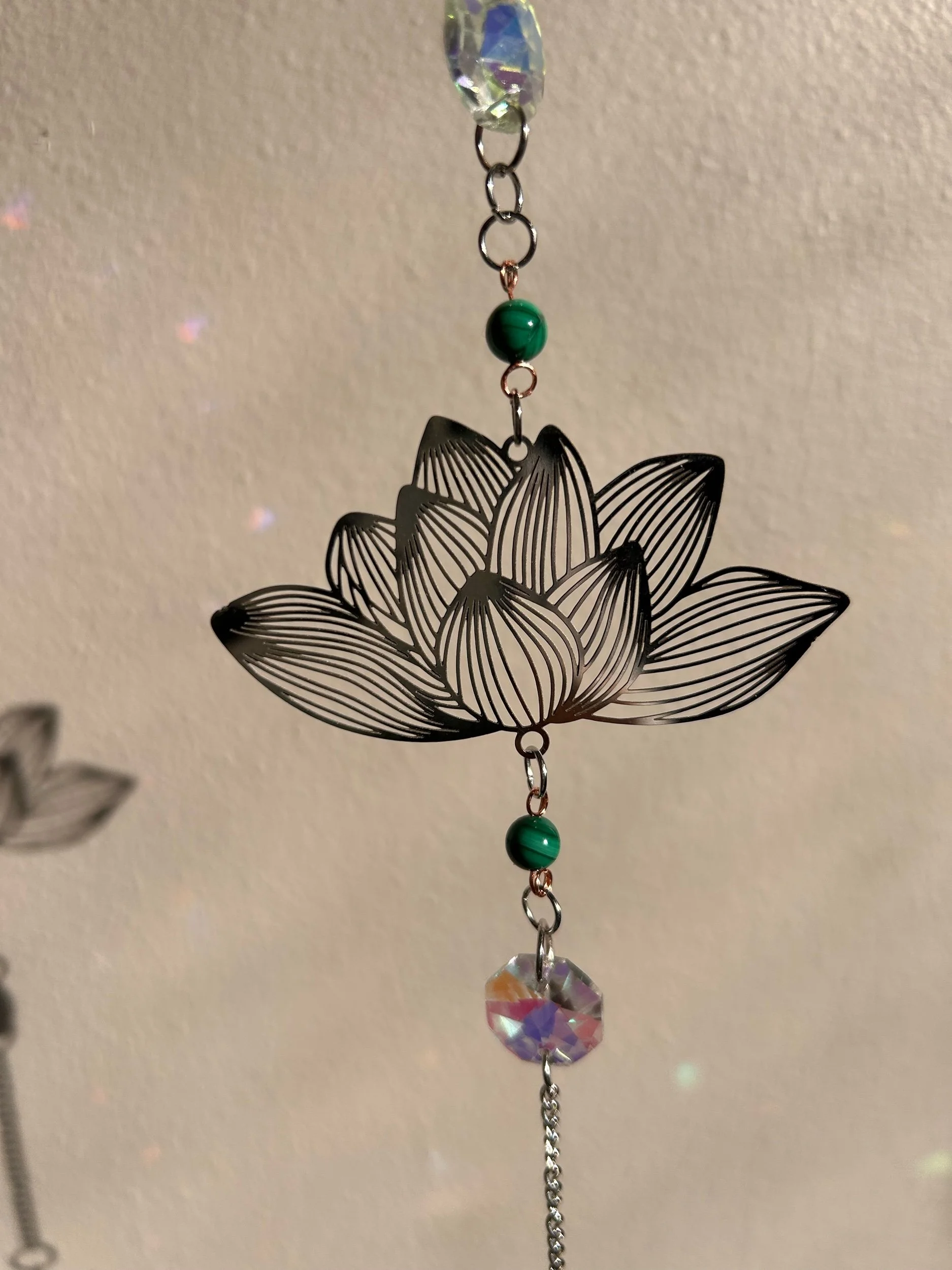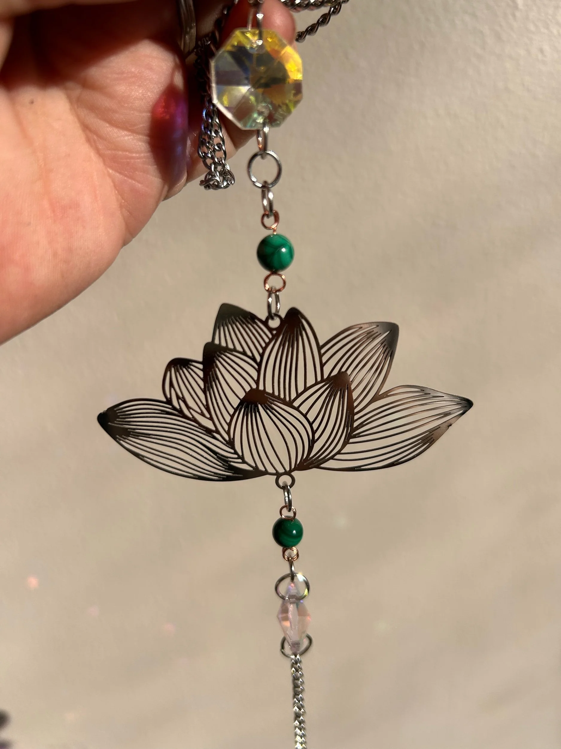 This handcrafted suncatcher features a beautifully detailed silver metal lotus as the centerpiece, accented with two genuine malachite beads and one genuine selenite bead for a powerful blend of clarity, protection, and transformation. Iridescent glass crystals catch the sunlight and scatter soft rainbow prisms across the room, creating a calming, magical atmosphere wherever it hangs.