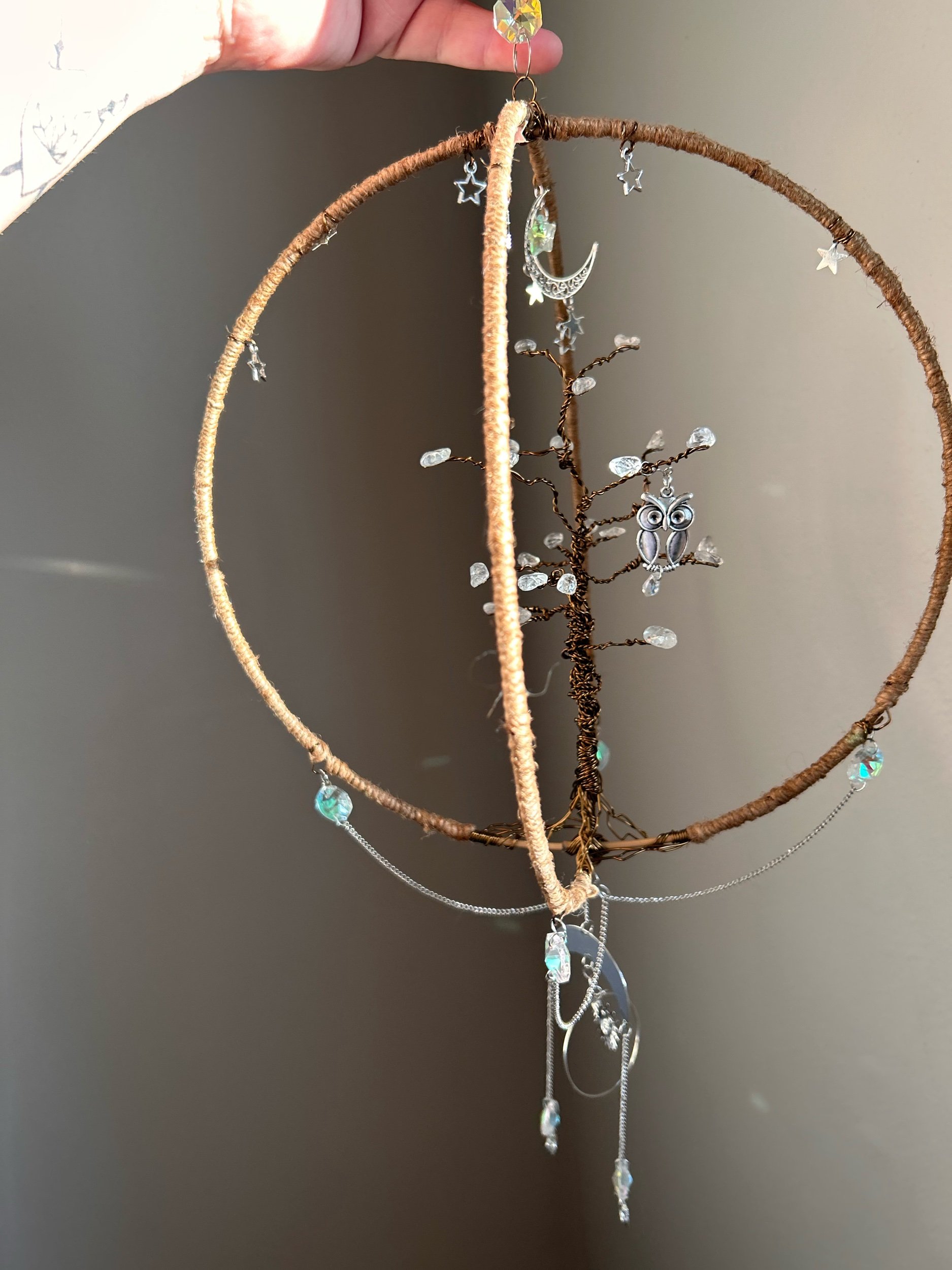 This one-of-a-kind, handcrafted celestial orb is created around the sacred principle of “as above, so below,” with every detail intentionally placed to mirror the harmony between the spiritual and earthly realms. Wrapped in warm, earthy cord, the dual-ring sphere holds a hand-wrapped aura quartz tree at its center — the living bridge between sky and soil, intuition and grounding.