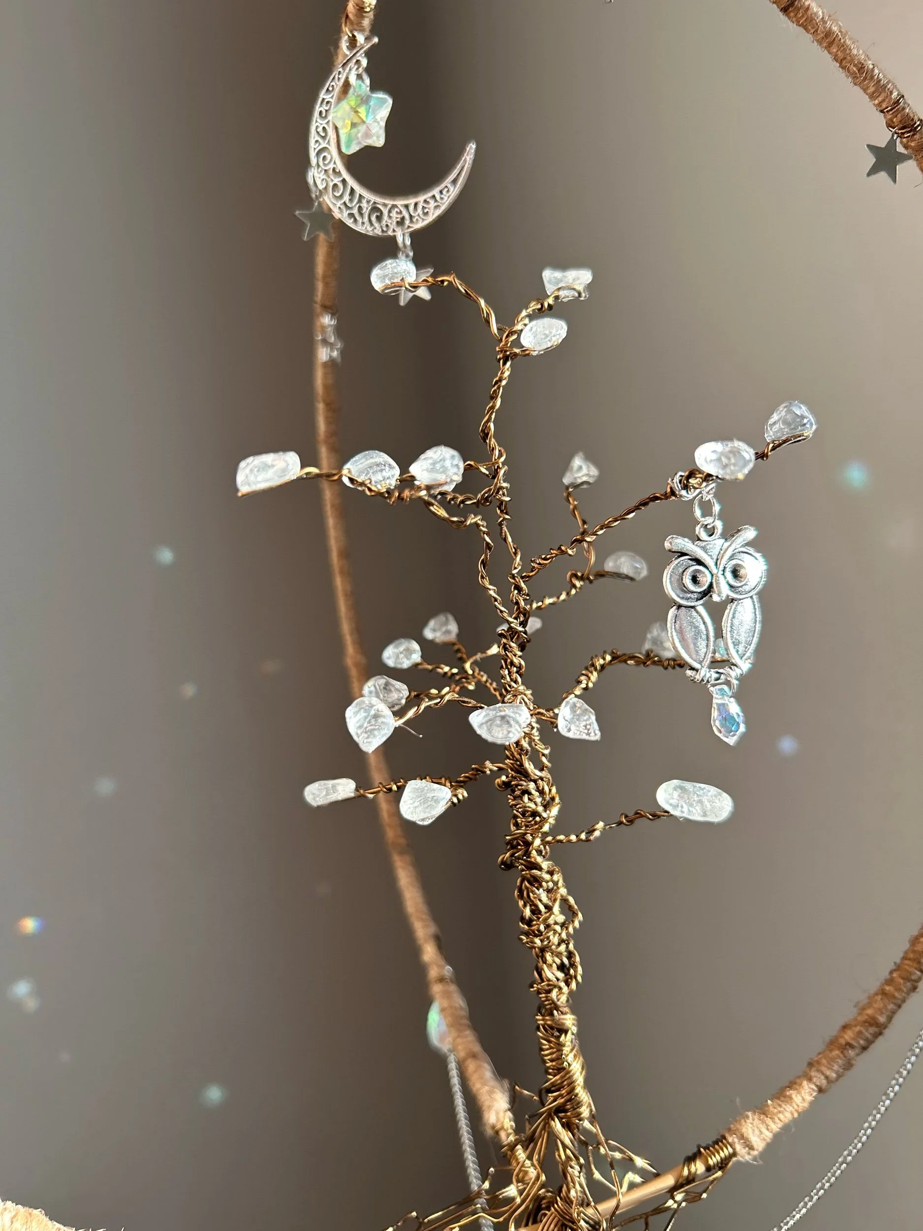 Above the tree, a silver crescent moon and delicate star charms float like a miniature night sky, representing higher guidance, cosmic intuition, and the realms that watch over us. Their soft shine crowns the orb with the energy of “the above.”